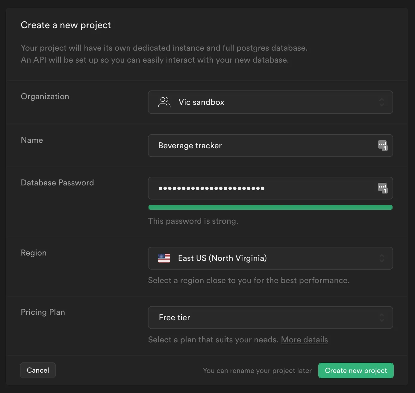 If you remember, we initted a PostgreSQL datasource when we set up Prisma. There are many different vendors to help us set up a database for development, and for this example we are going to use Supabase. Let’s sign up for an account with Supabase and create a free New Project (you’ll be asked to create a new Organization first).